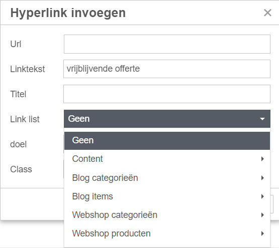 2a. Onder 'Link list' kun je vervolgens kiezen uit verschillende categorieën. Wil je een gewone contentpagina gebruiken? Dan vind je die onder 'content'. Verder vind je hier blogcategorieën, blogitems, webshopcategorieën en webshopproducten. Selecteer de pagina die je wilt gebruiken en klik op 'Oké'.