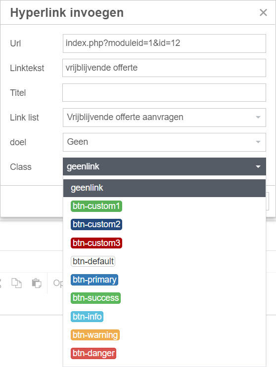 Onder 'Class' vind je verschillende soorten knoppen. De eerste 3 knoppen zijn custom en zijn speciaal voor jouw website gemaakt, zodat ze bij je website passen. Klik vervolgens op 'Oke'.