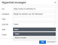 Het invoegen van een externe link werkt op dezelfde manier als het toevoegen van een interne link. Vul de volledige URL van die pagina in. Onder 'doel' klik je nu op 'Nieuw venster'. Wanneer iemand dan op de link klikt, opent er een nieuw venster of tabblad. Zo raak je de bezoeker niet kwijt wanneer ze op de externe link klikken.